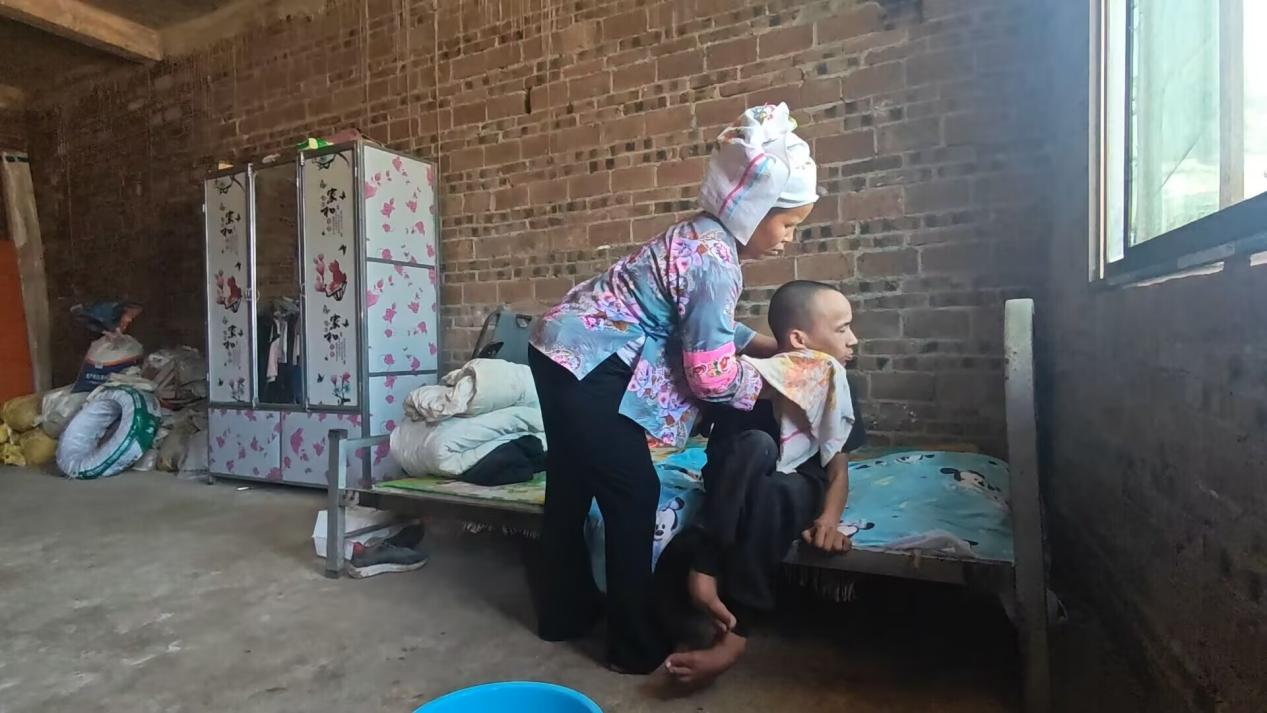 推开她家简陋却干净整洁的大门,来到三楼,房间里两个瘫痪儿子的身影映入眼帘,黄里光的忙碌从未停歇:换衣、擦洗、喂饭、按摩,每一个动作都娴熟轻柔。“他自己不能睡,饭也需要喂,大小便不能自理。”谈及大儿子黄万良,她声音满是疲惫,却无半分抱怨,这份坚守早已刻入骨髓。